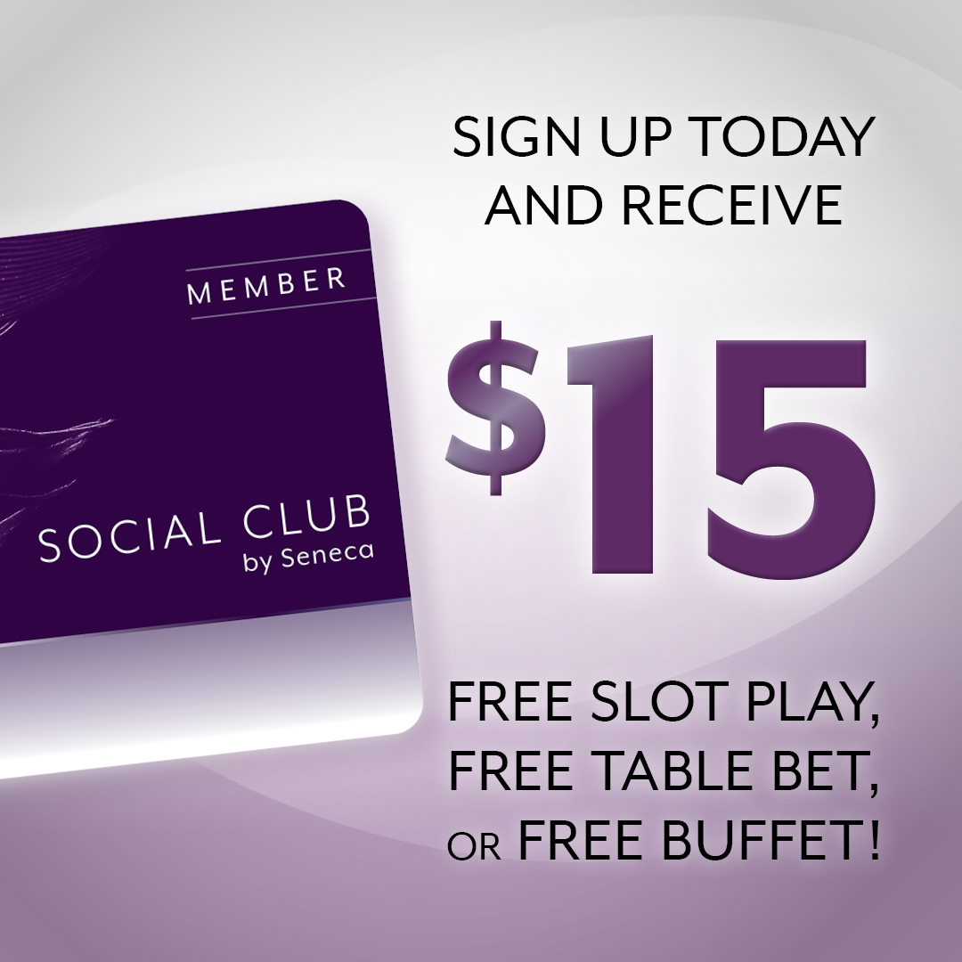 *Offer valid only on day of enrollment. Must be a newly enrolled Social Club by Seneca member. Must be 21 years or older to register for a Social Club card at Seneca Niagara Resort & Casino, Seneca Allegany Resort & Casino or Seneca Buffalo Creek Casino. Bus groups are not eligible to participate in New Member offer.